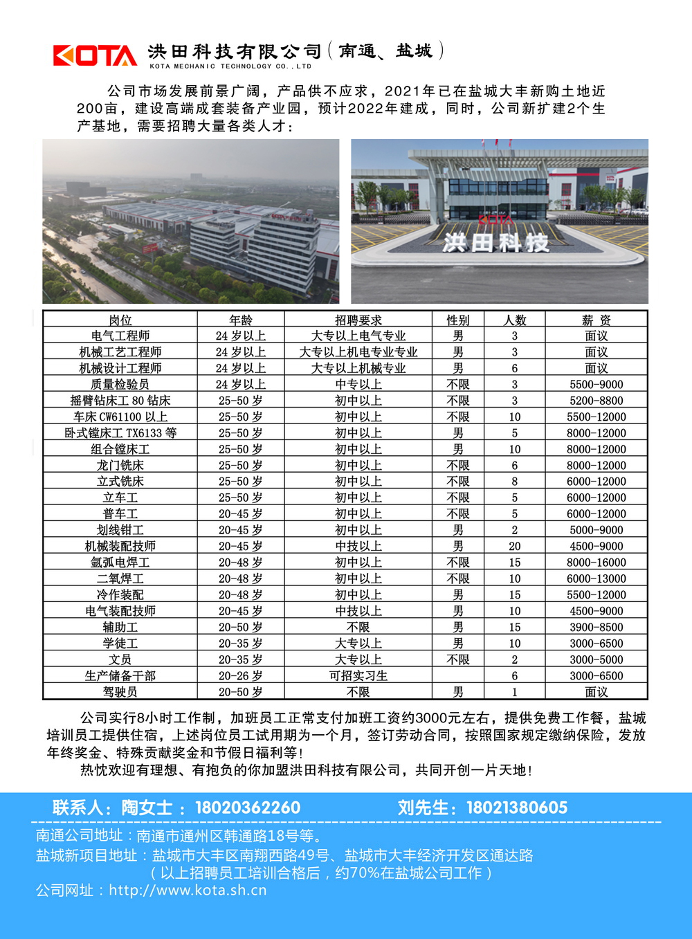 Yancheng New Project Adres: No. 49, Nanxiang West Road, Dafeng District, Yancheng City, Tongda Road, Dafeng Economic Development Zone, Yancheng City (nadat de bovengenoemde aangeworven werknemers gekwalificeerd zijn in training, zal ongeveer 70% werken in Yancheng Company)